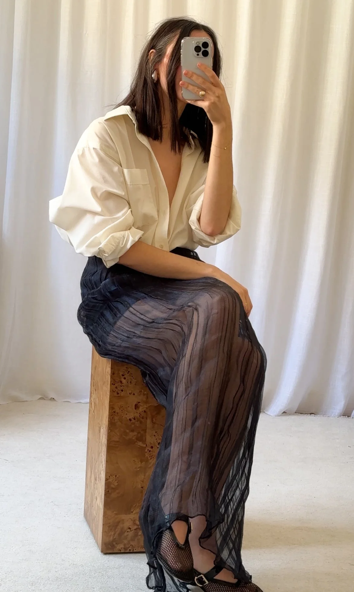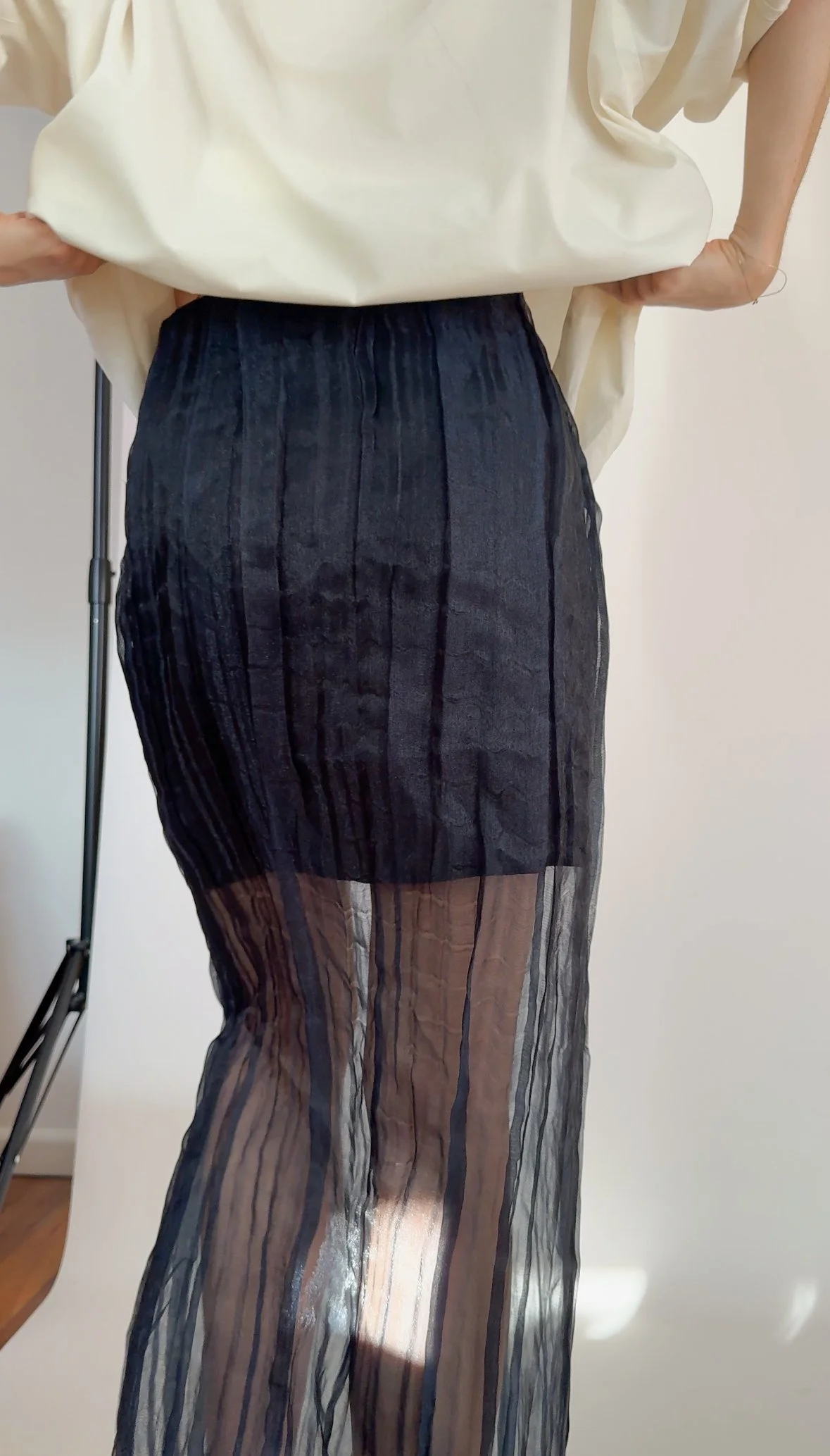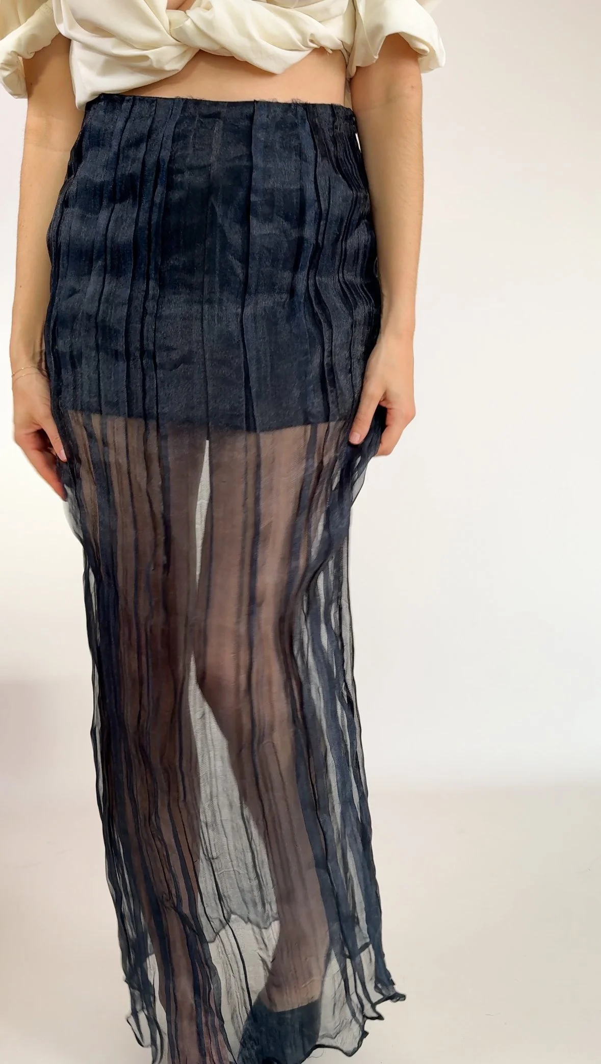 Absolutely stunning vintage Scanlan Theodore skirt in a textured crinkled fabric that catches the light. Midnight blue. Quintessential 90s style.