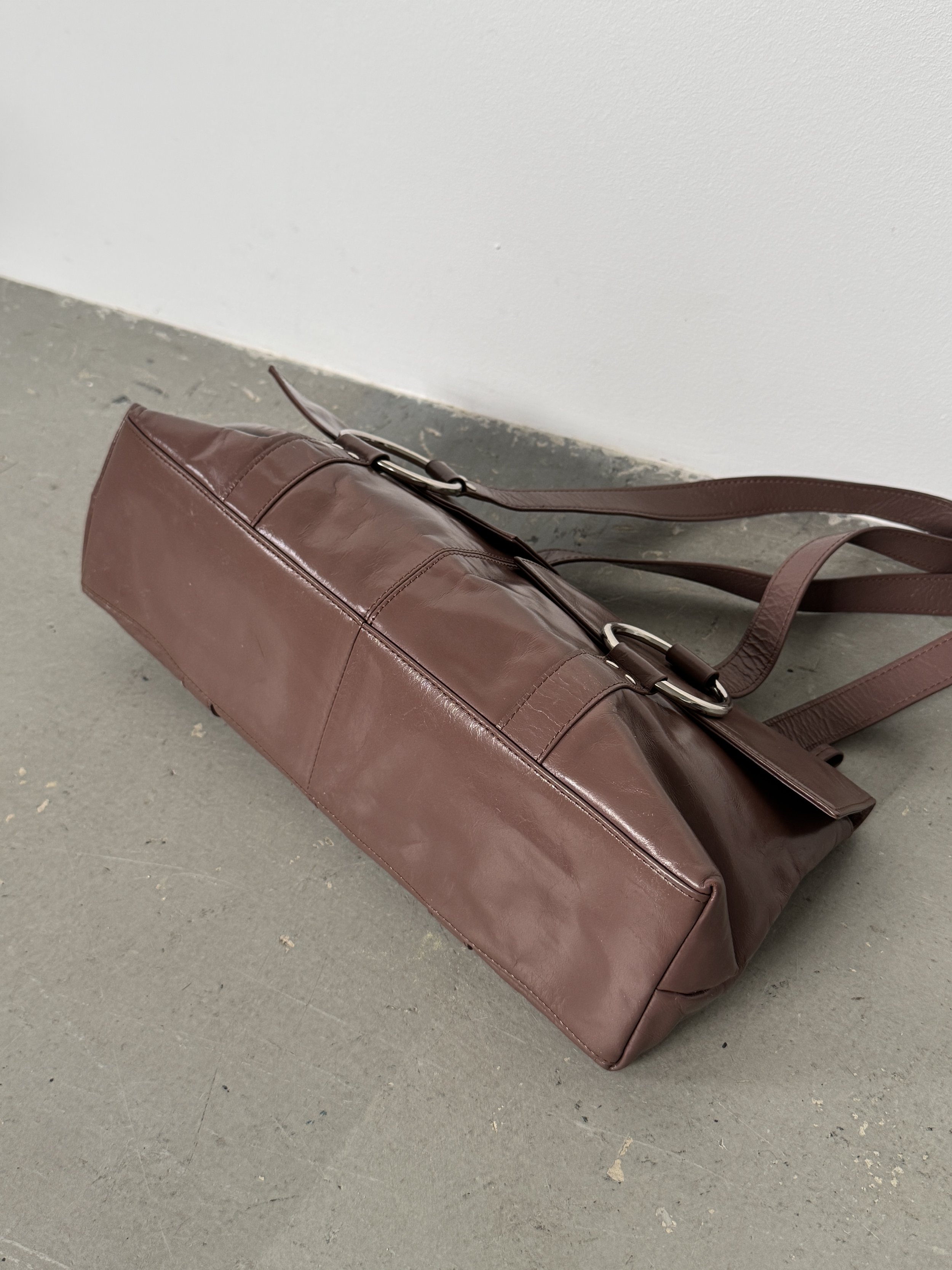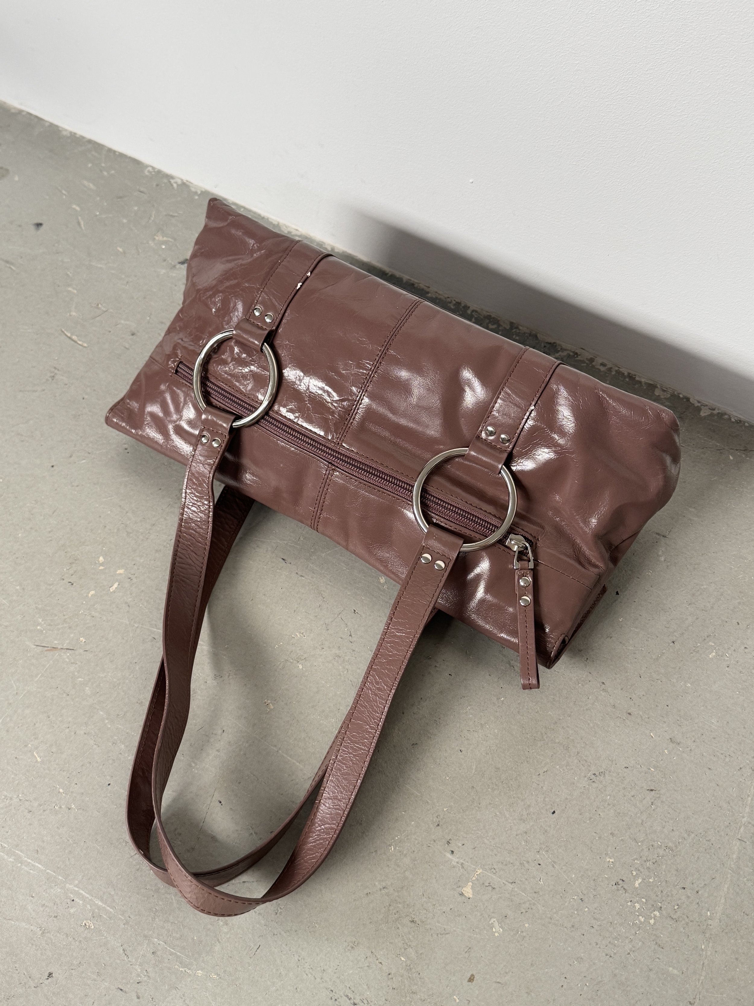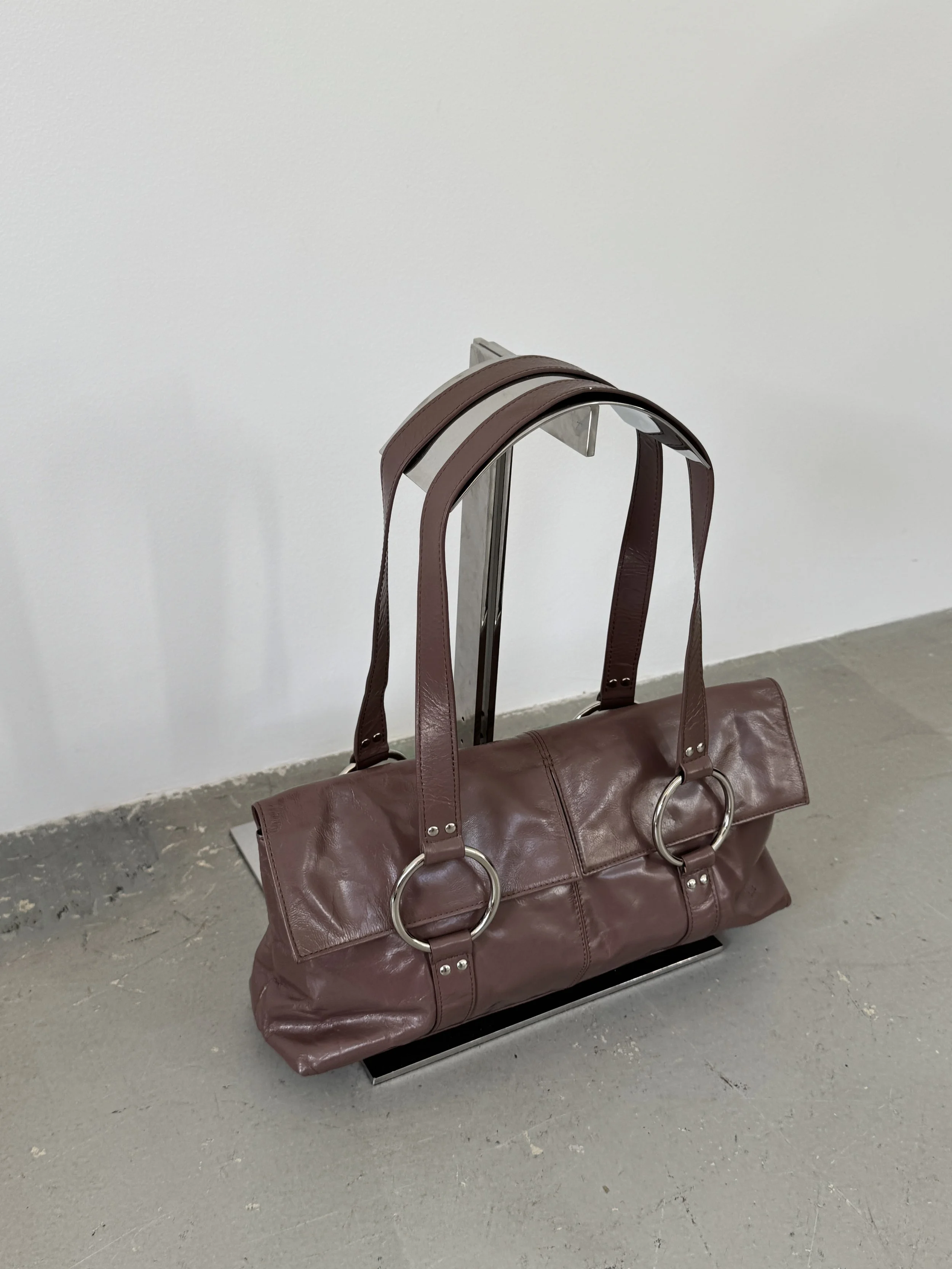 Amazing Y2K soft leather shoulder bag in deep mauve with silver eyelet detailing. The colour changes in the images depending on the lighting. It is closer to mauve than burgundy.