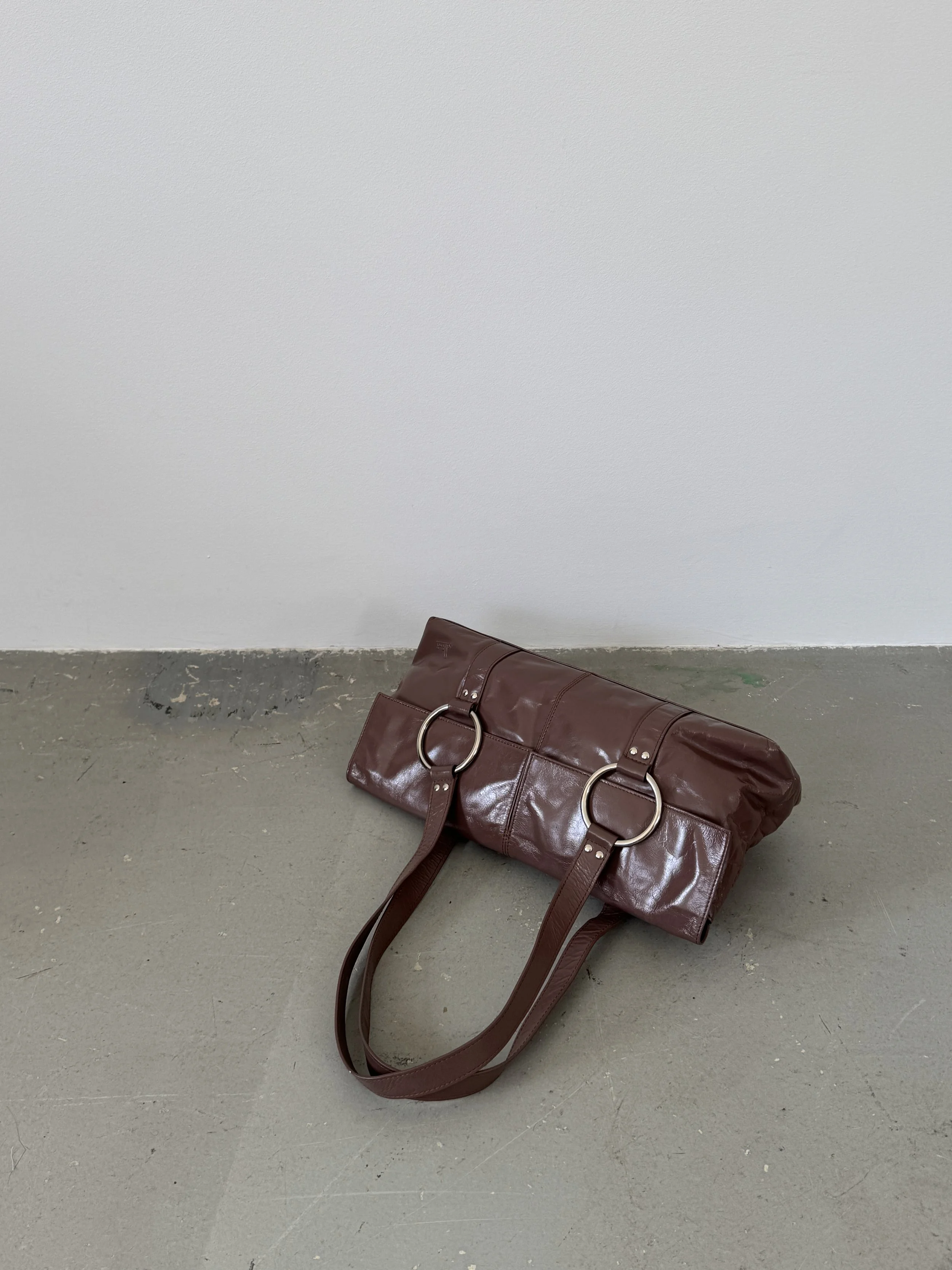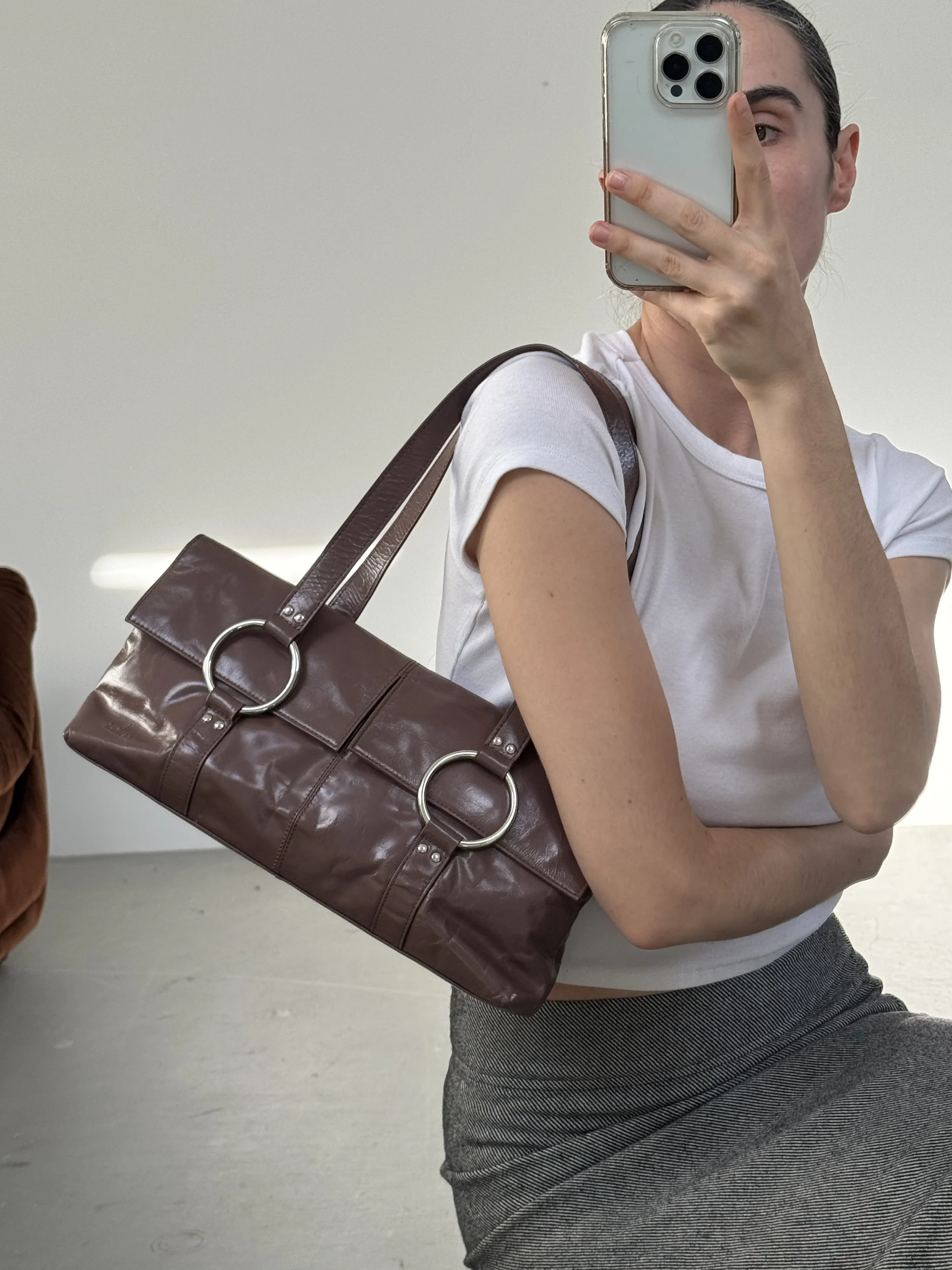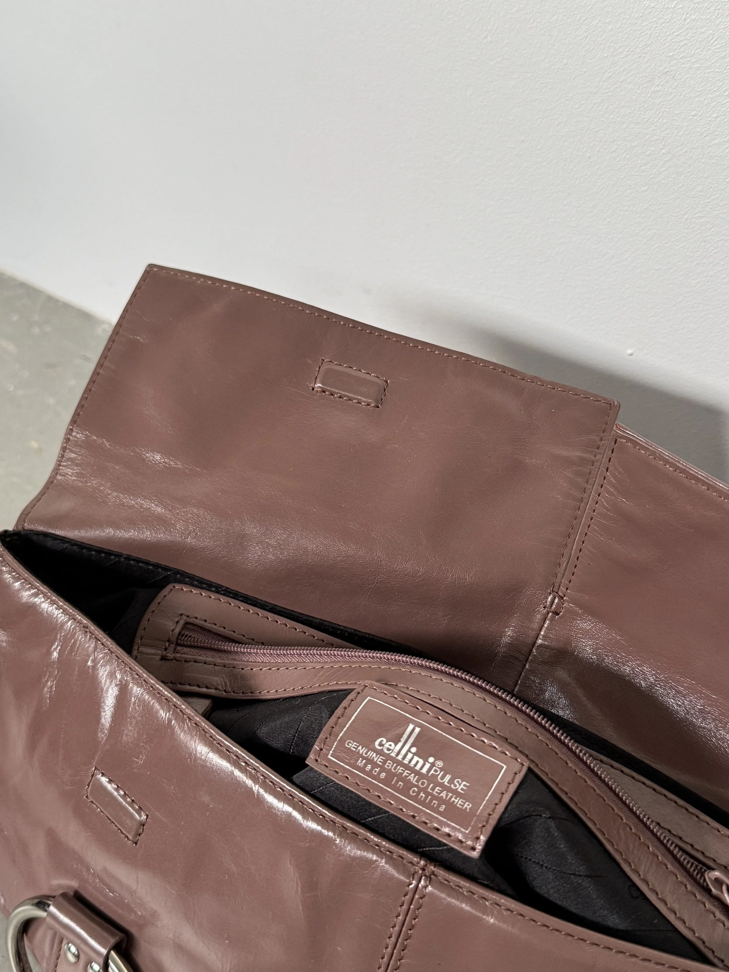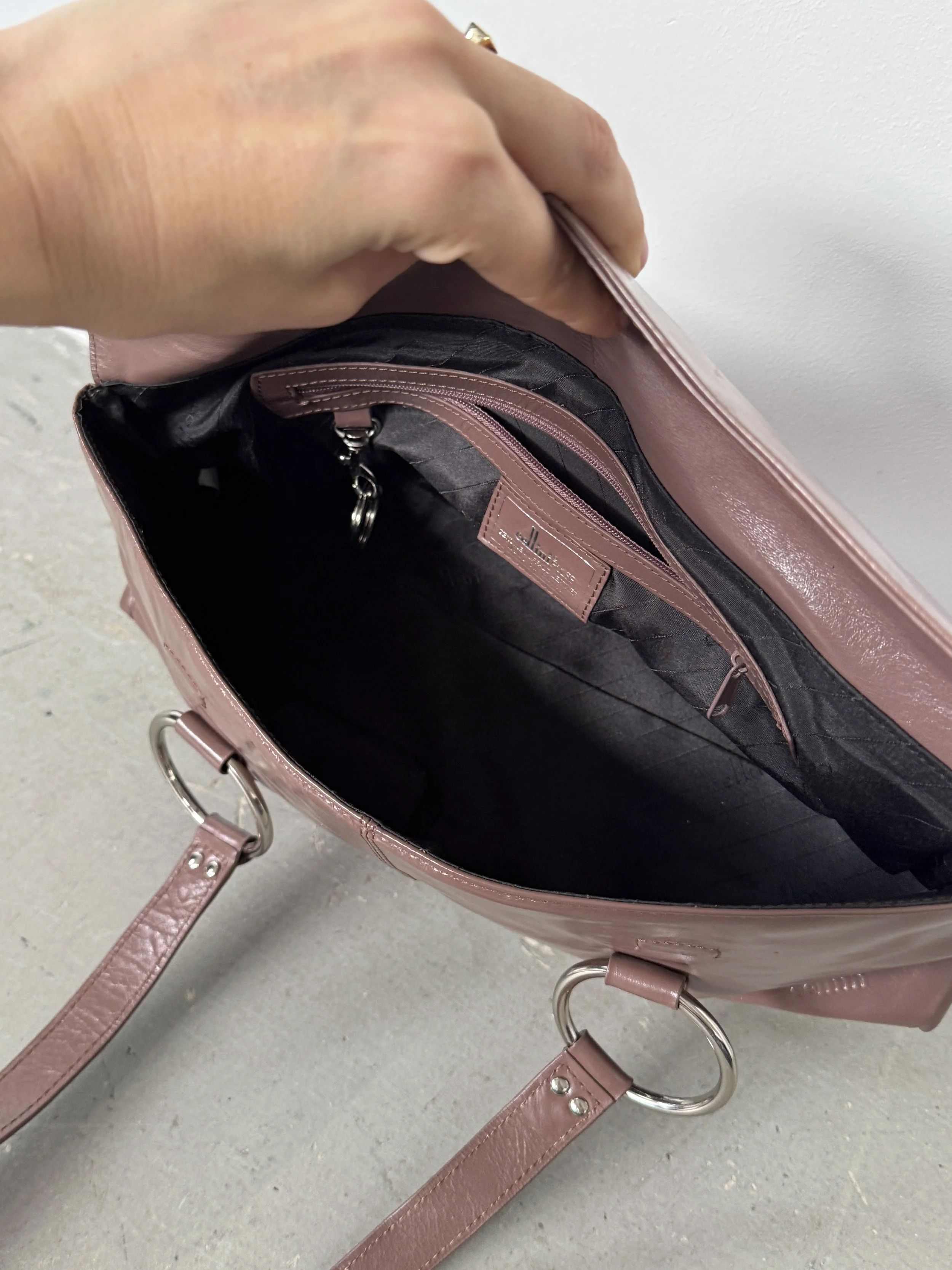 Amazing Y2K soft leather shoulder bag in deep mauve with silver eyelet detailing. The colour changes in the images depending on the lighting. It is closer to mauve than burgundy.