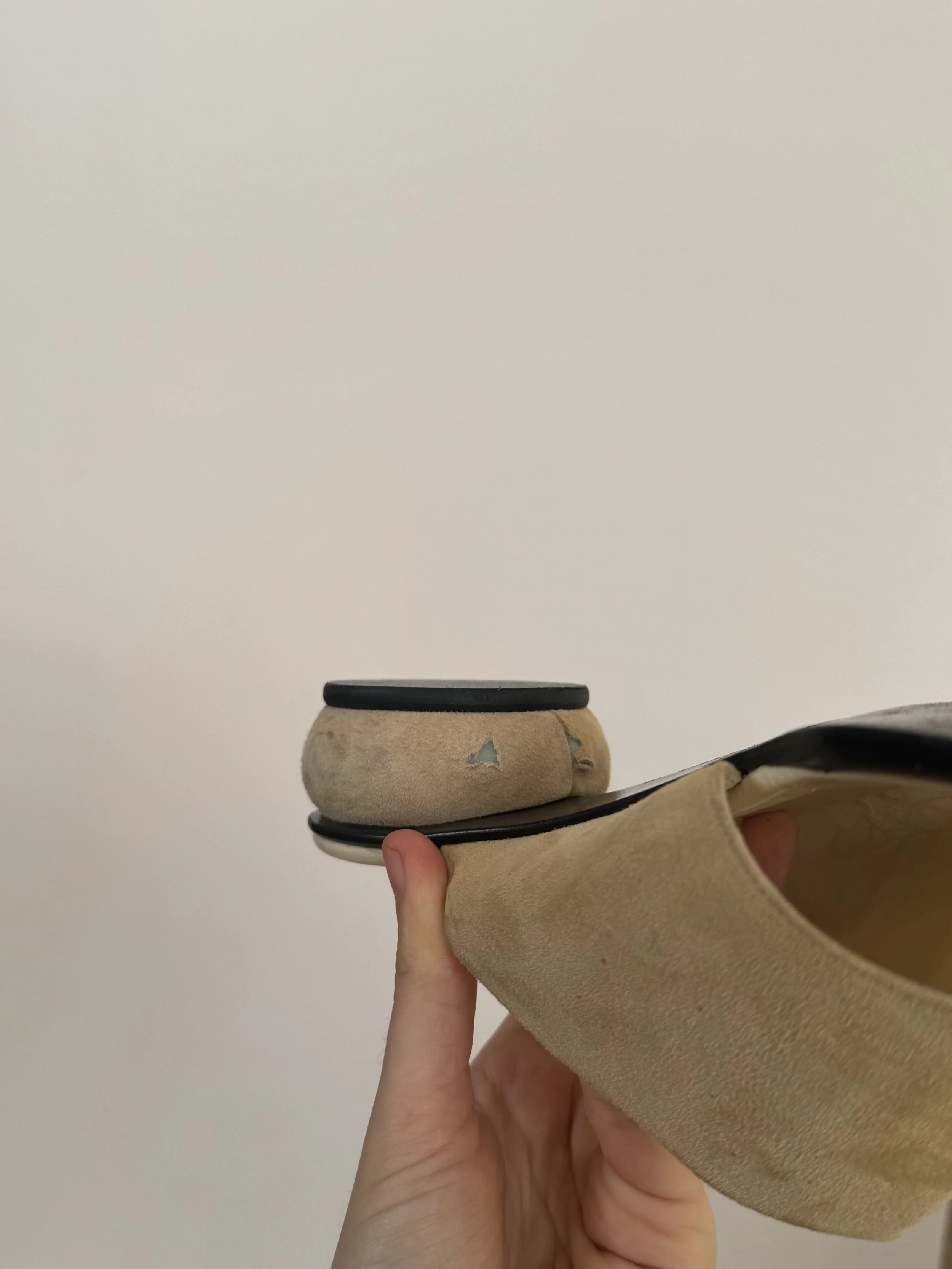 CONDITION: Has signs of wear as per the nature of vintage. There are some small marks in the suede as pictured and a few scuffs on the suede block heel as pictured.