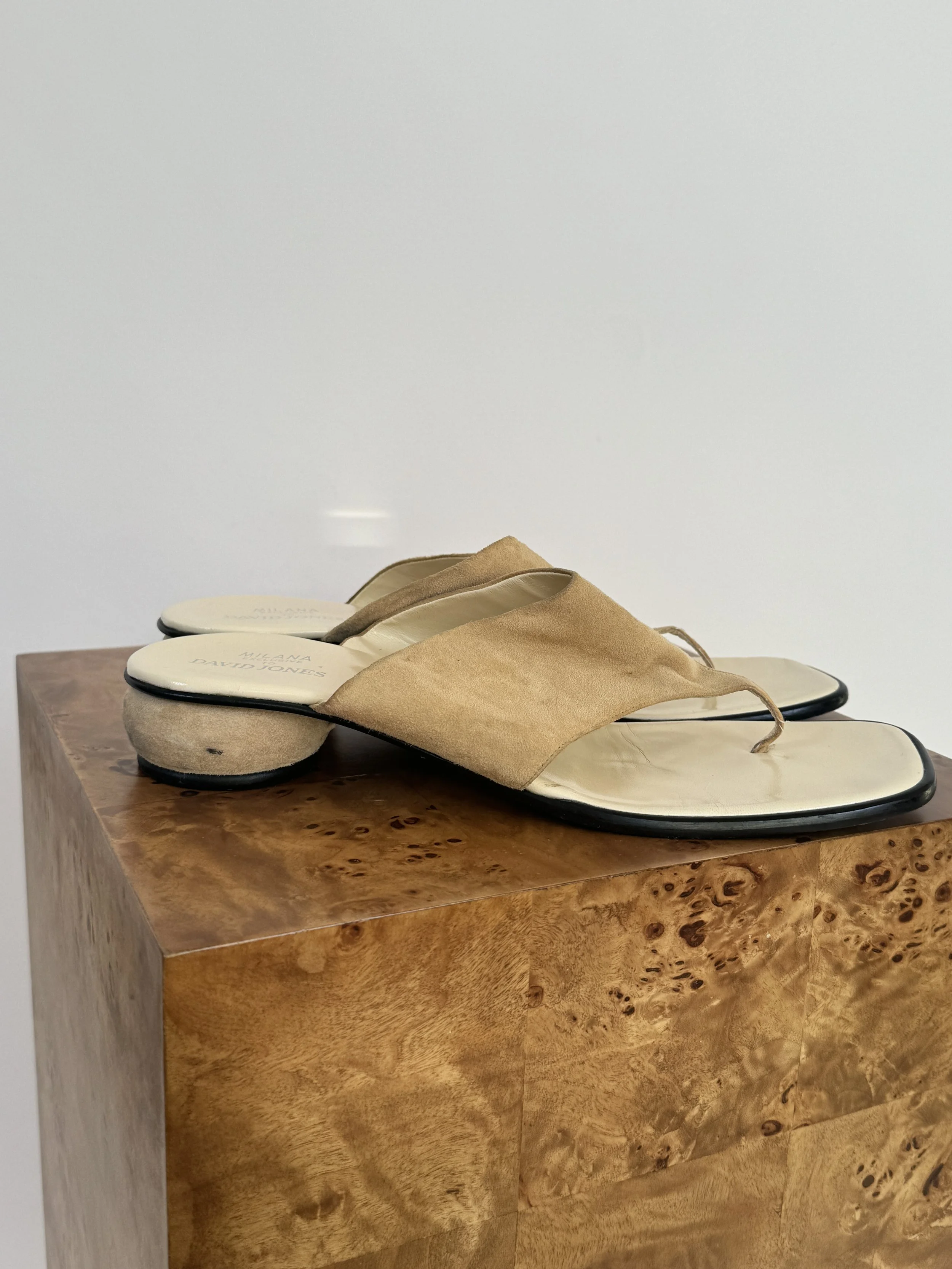 Gorgeous butter yellow suede 90s thong heels with the cutest block heel! Made in Italy.