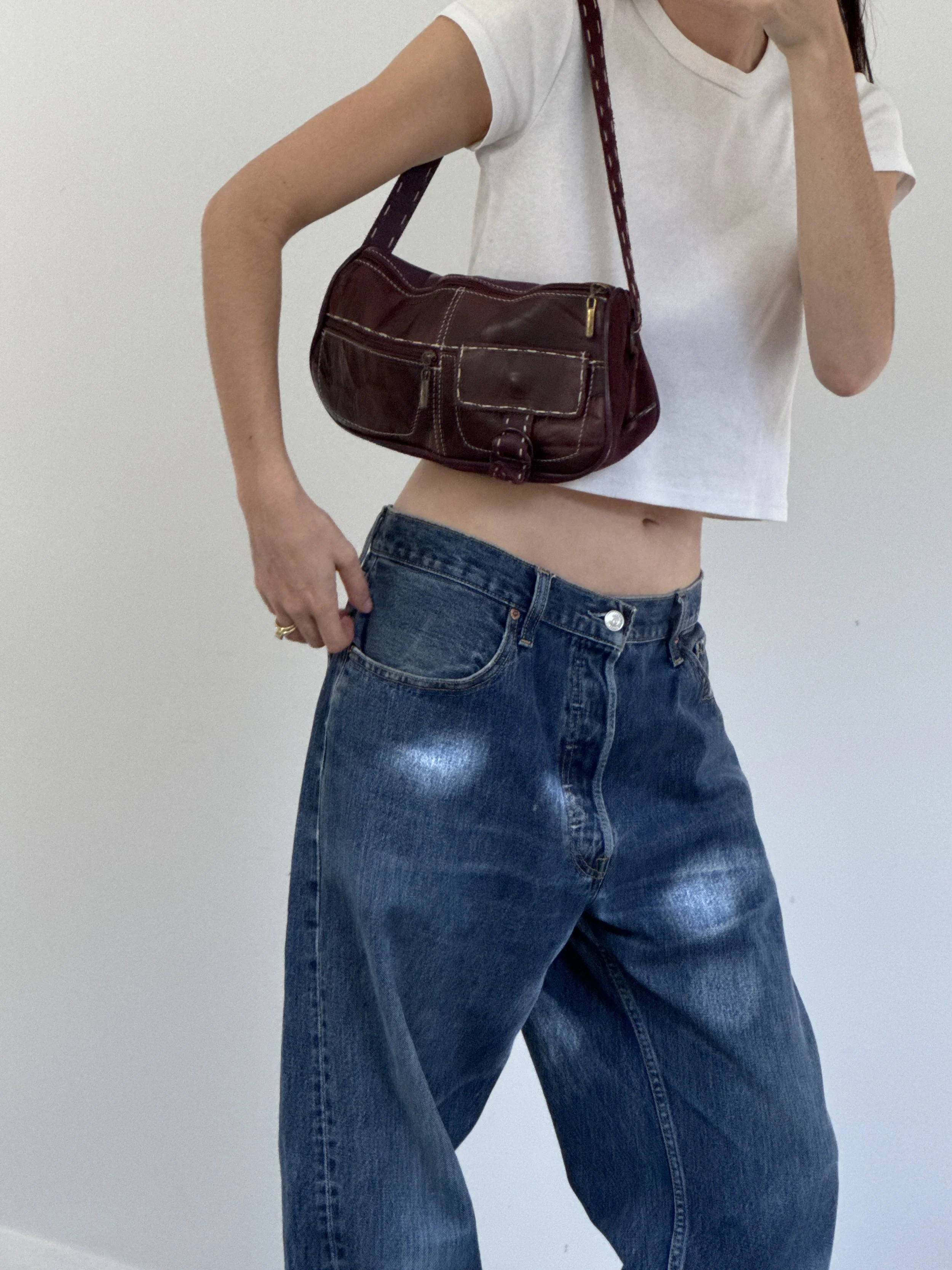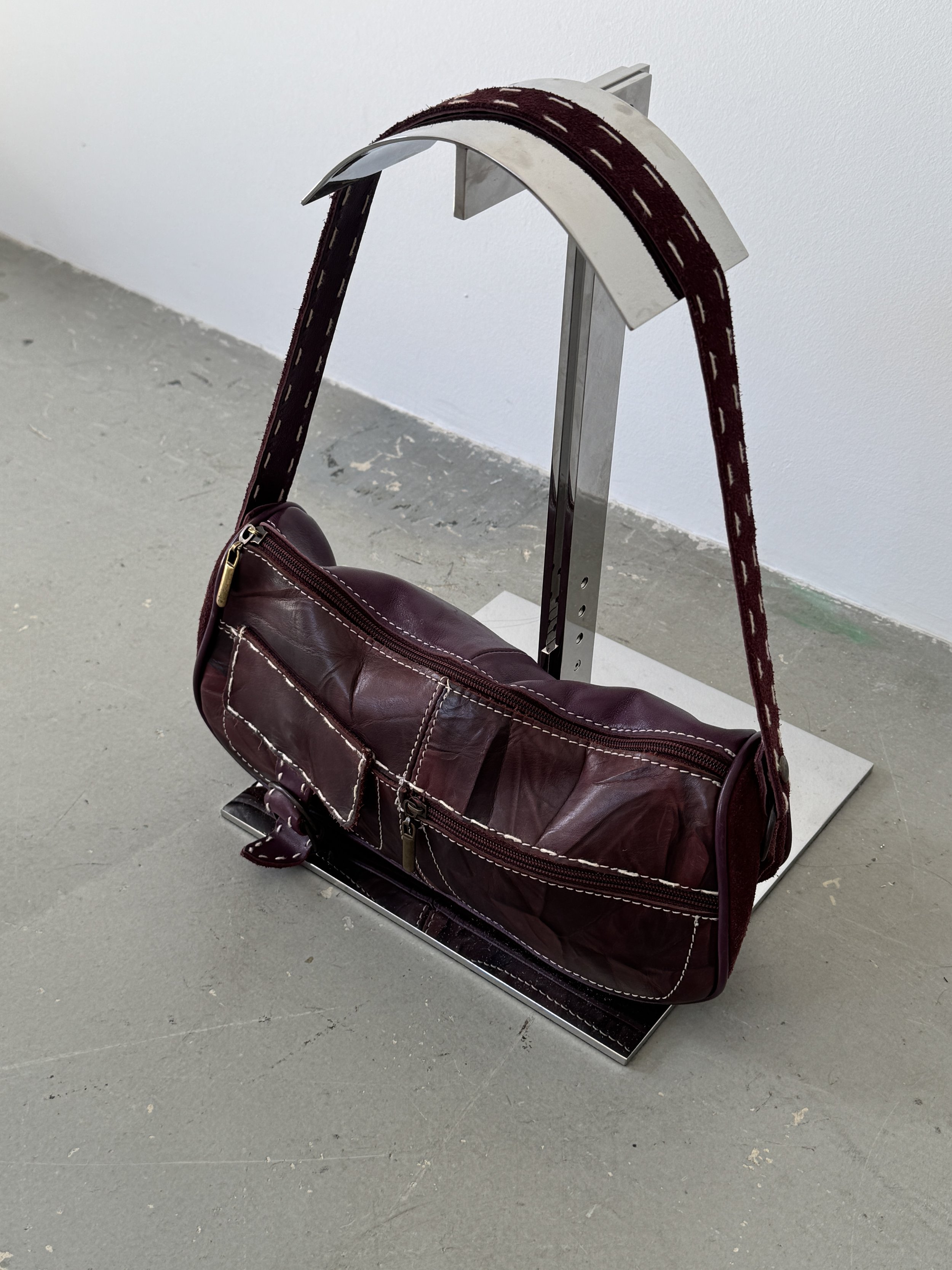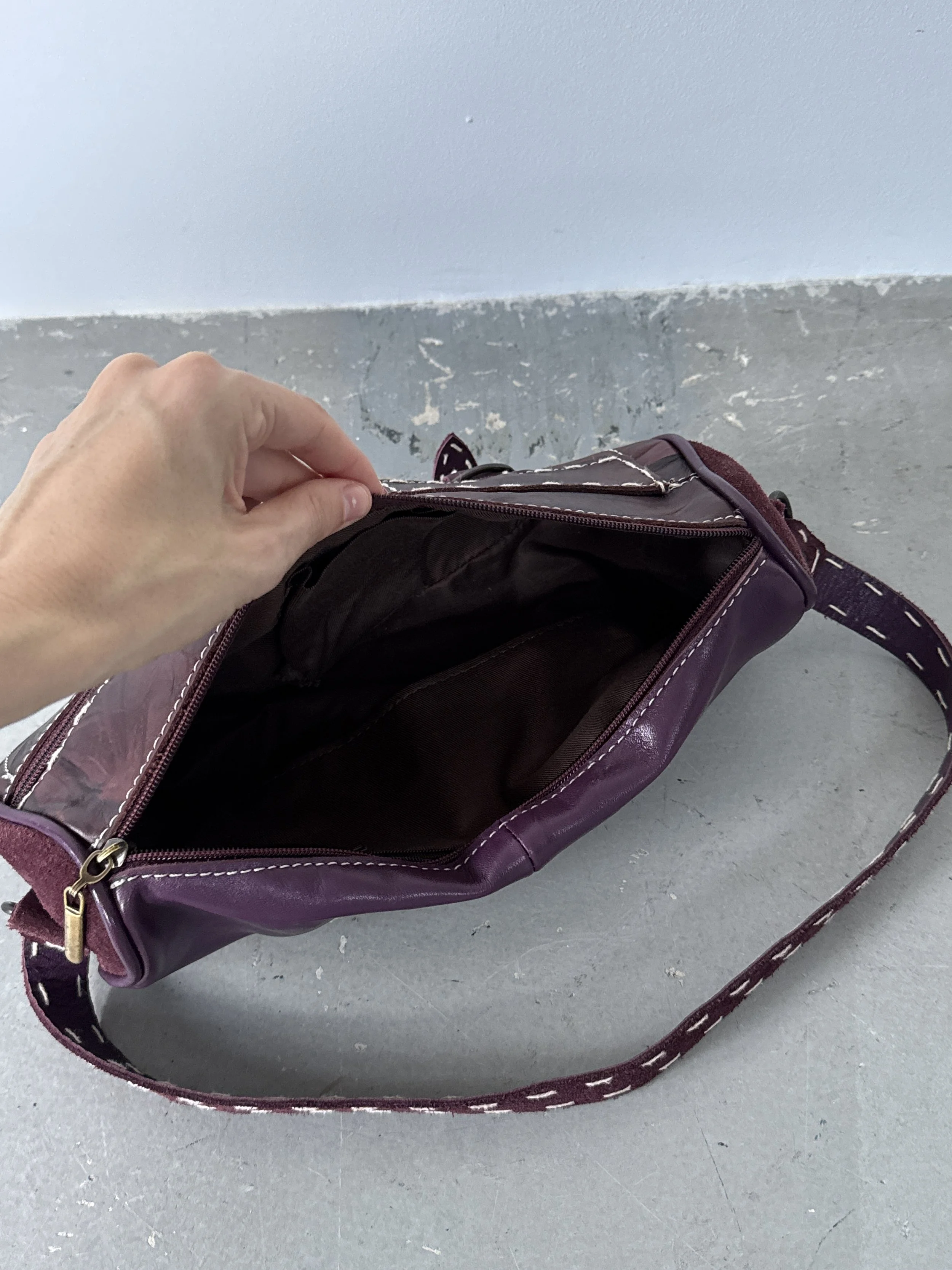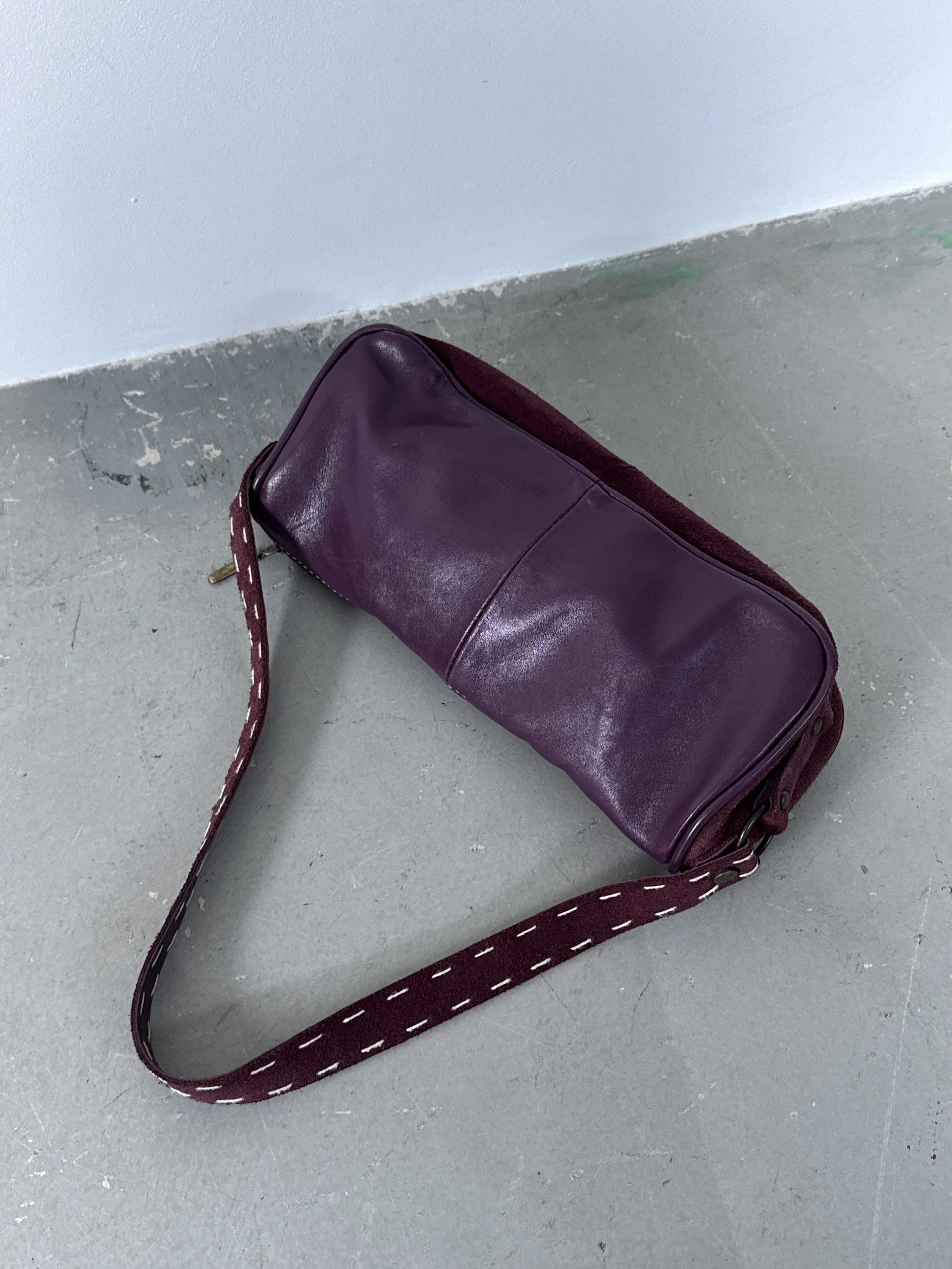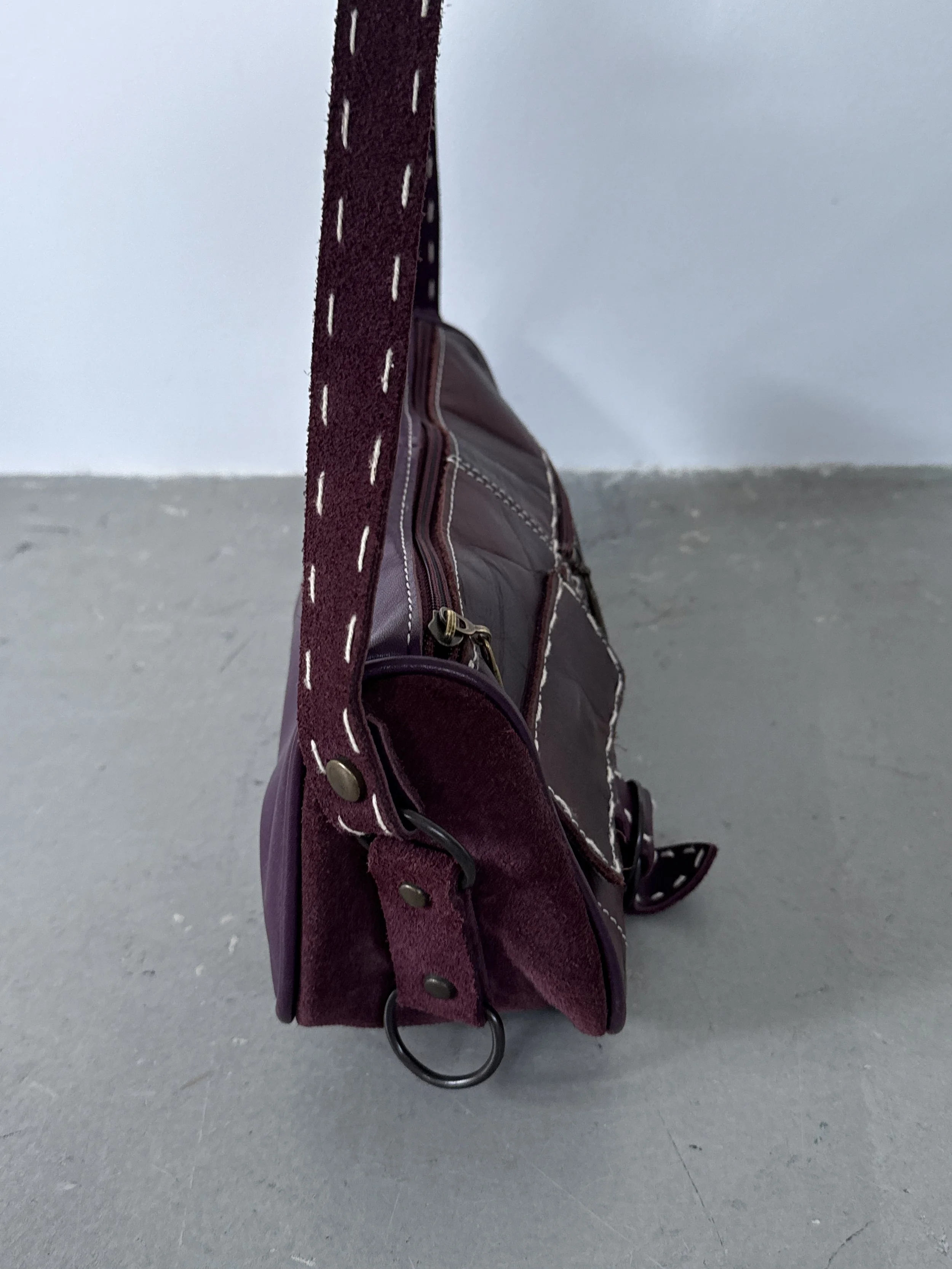 The most incredible leather and suede shoulder bag in dark purple with contrasdt cream stitching!