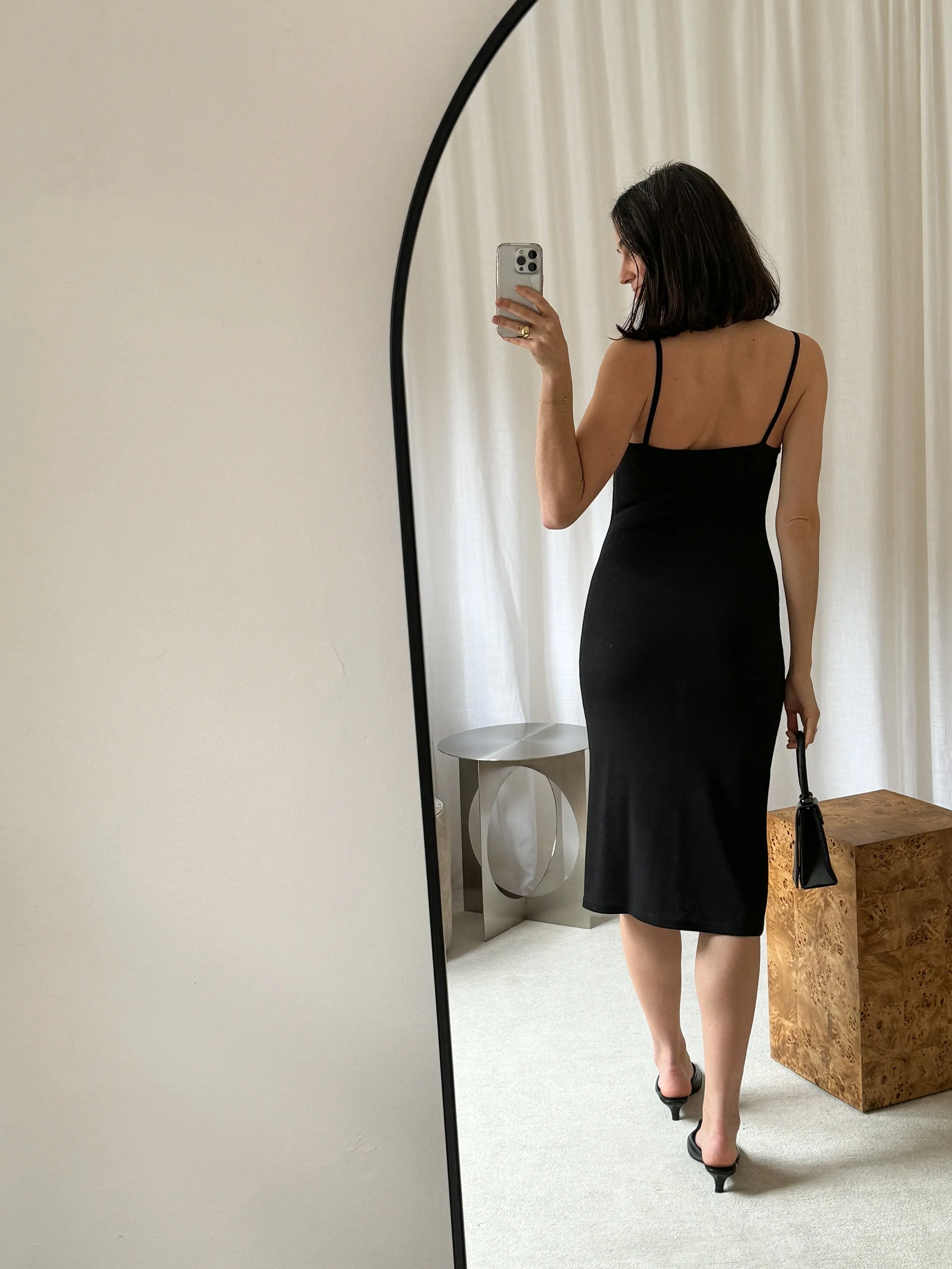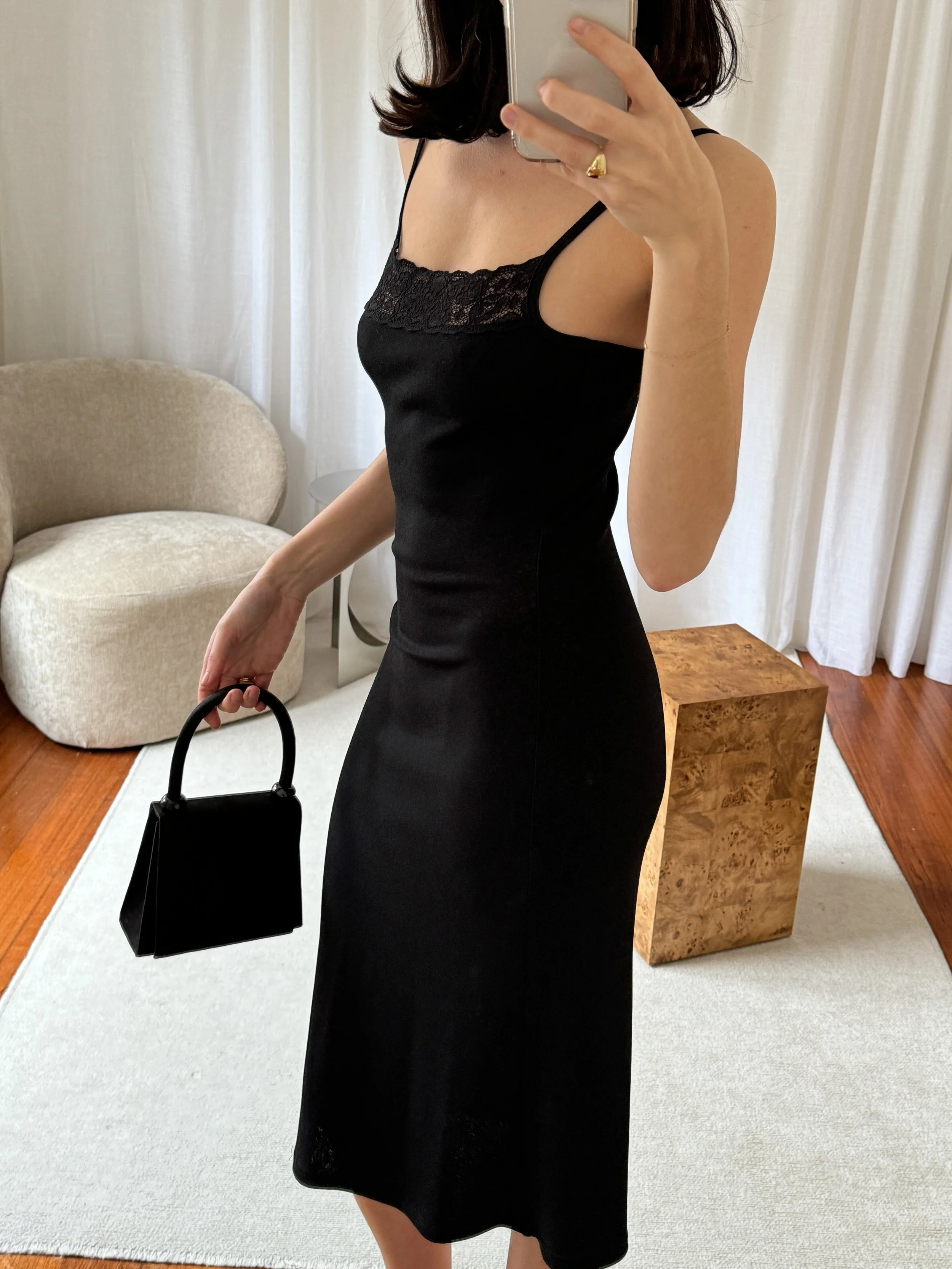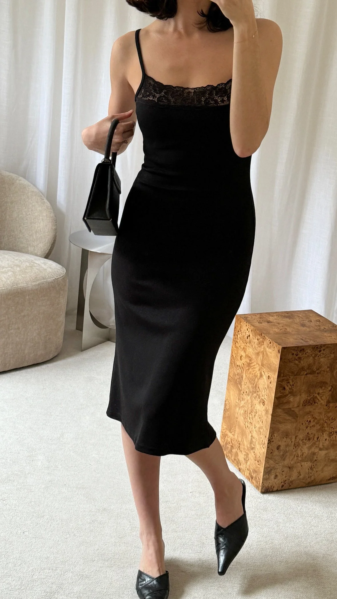 Minimal 90s black lace trim midi dress. Feels like a fine stretchy crepe knit material. Very flattering!